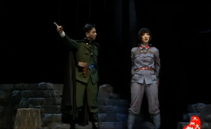 我老婆是文工团的演员,近来她们团里为迎接建军节,正在赶排一部话剧“红魂”,讲的是苏区沦陷后几个女红军的遭遇。我老婆扮演的是一个漂亮的红军女政委,同反动民团战斗时弹尽粮绝,用大刀与敌人搏斗力竭被俘,被五花大绑游街示众后押到大土豪劣绅家里关了起来,民团团总看女政委漂亮,没舍得杀头,妄想娶作姨太太,被我老婆臭骂了一顿,于是恼羞成怒,对女政委酷刑拷打,并威胁要扒光她衣服示众,我老婆坚贞顽强,眼看就要受辱,幸得一混在土毫府中当烧饭师傅的革命群众相救,松绑后趁天黑逃了回去继续同敌人战斗。