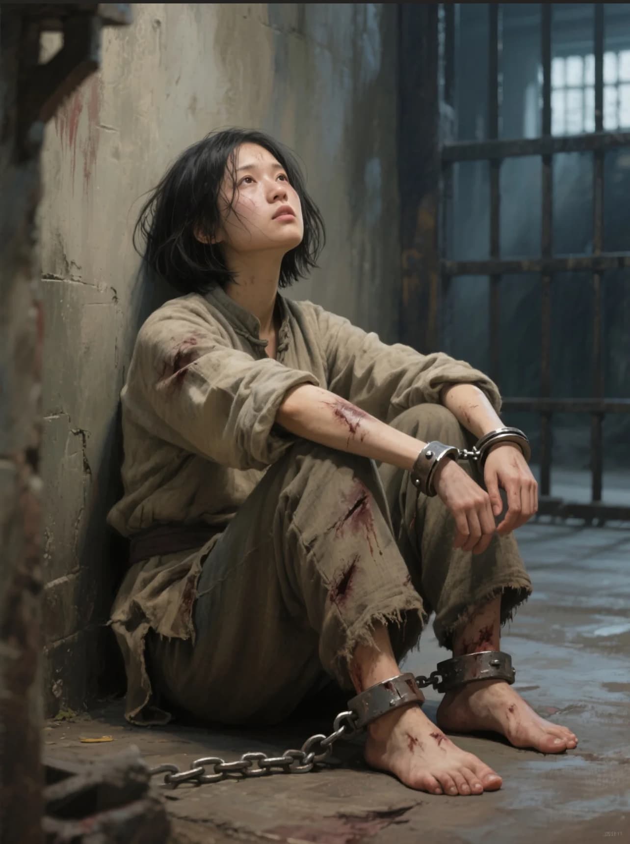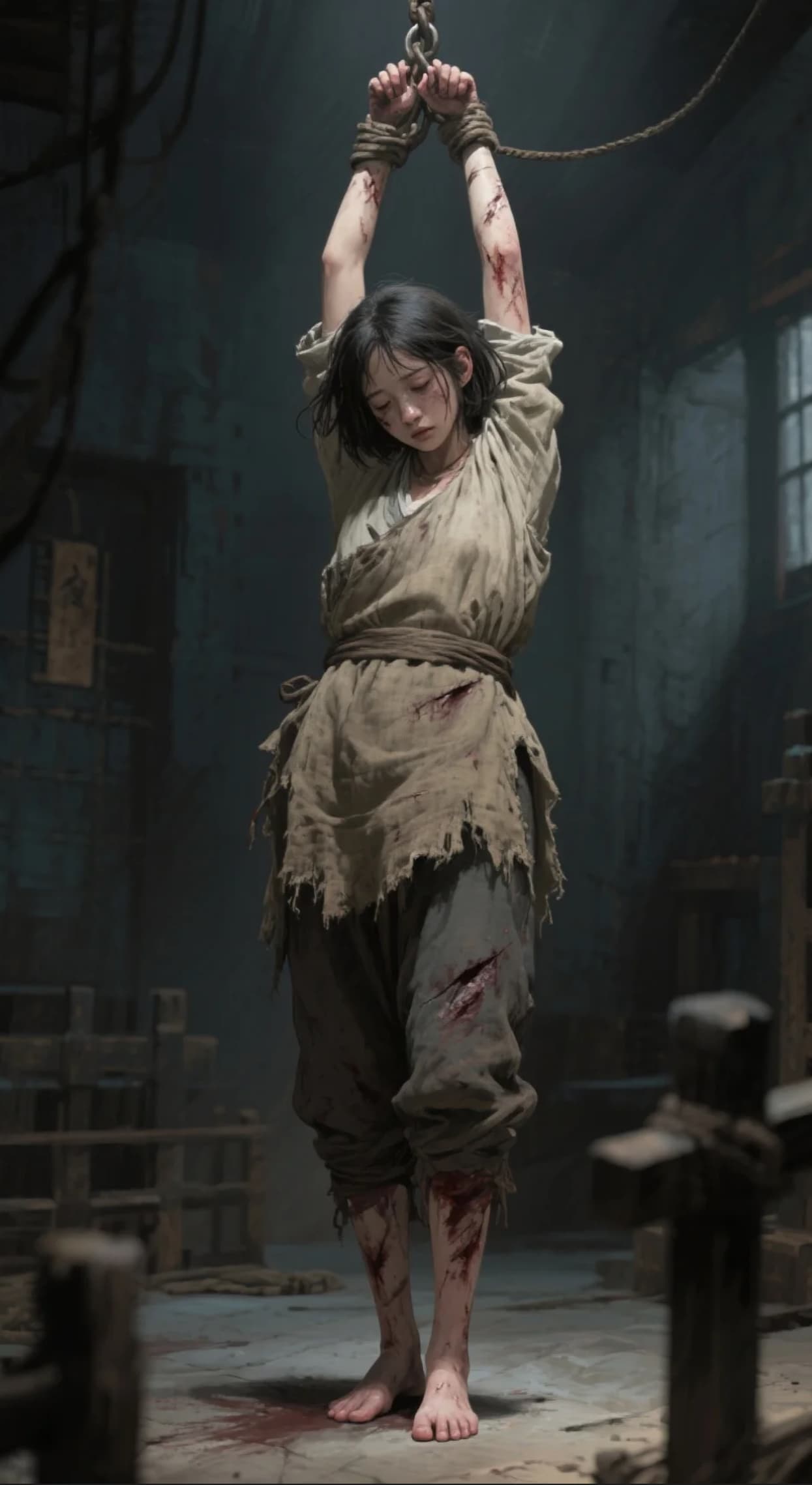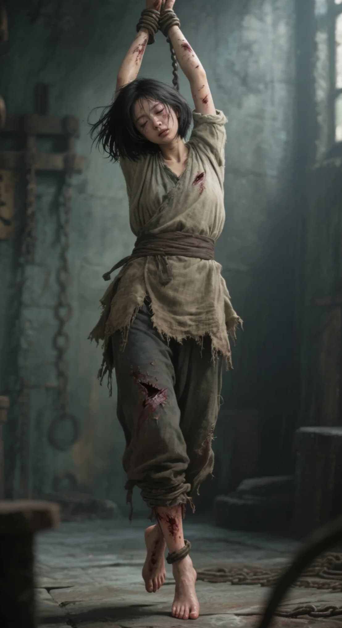 沈岚的粗麻囚衣碎成破絮,血痕从肩头渗到脚踝,乌青的脸歪靠一旁,乌发黏在汗津津的脸颊。腕间铁链深深勒进渗血的皮肉,整个人陷在昏迷的死寂里,像是耗尽最后一丝气力才撑住这具躯壳。曾经在学堂里振臂喊着“救亡图存”的鲜活模样,和眼前遍体鳞伤的躯壳重叠又撕裂。