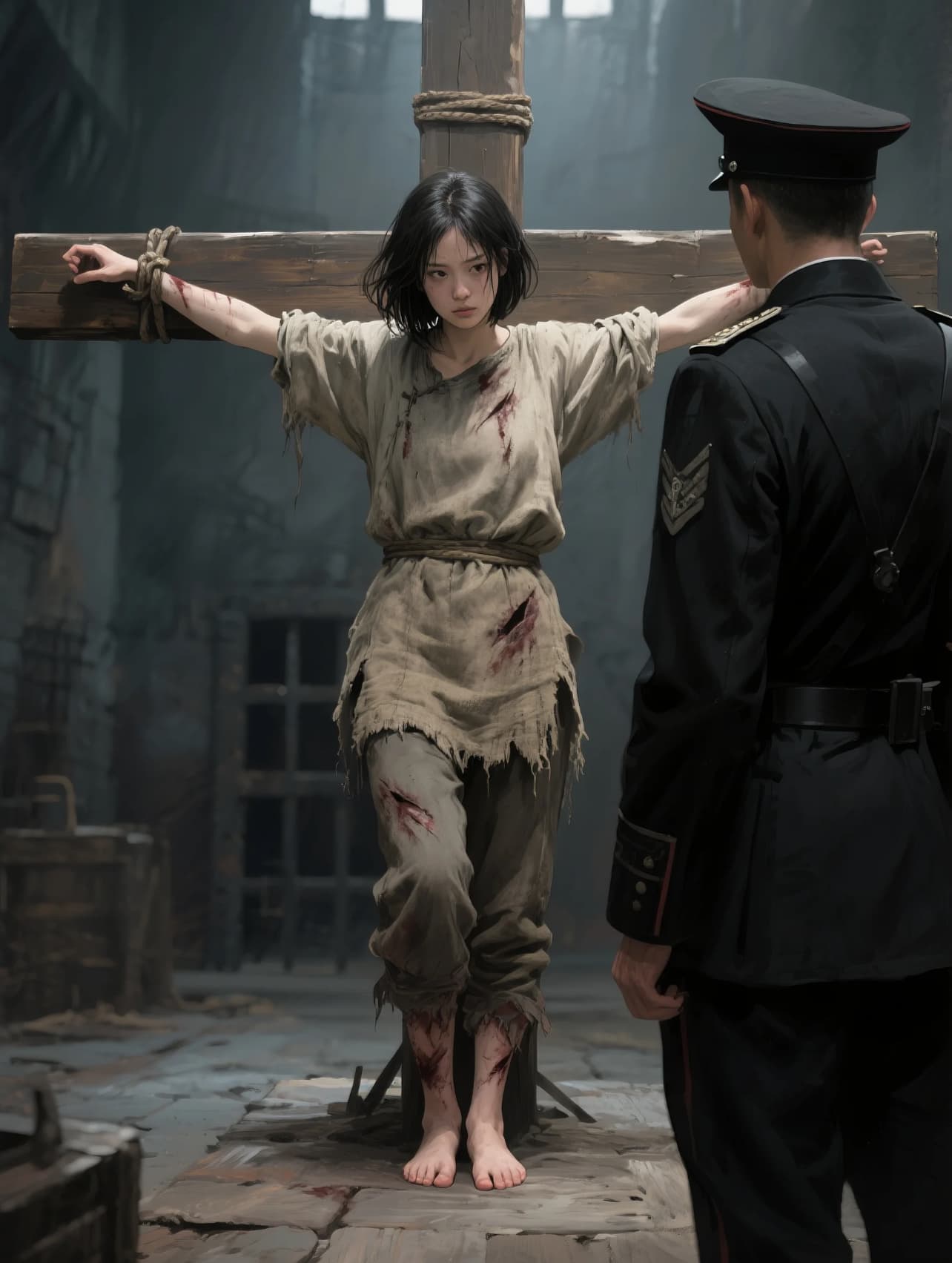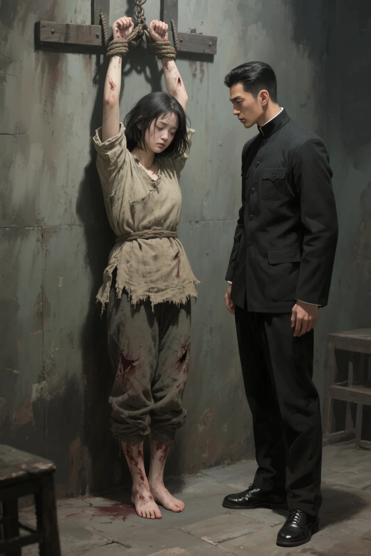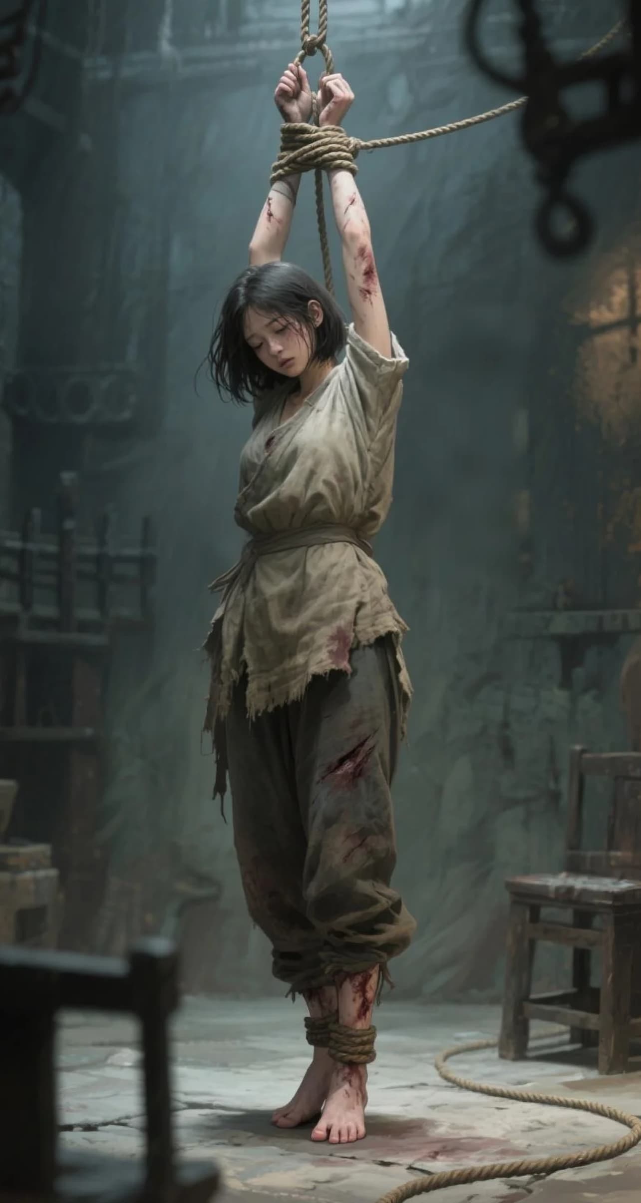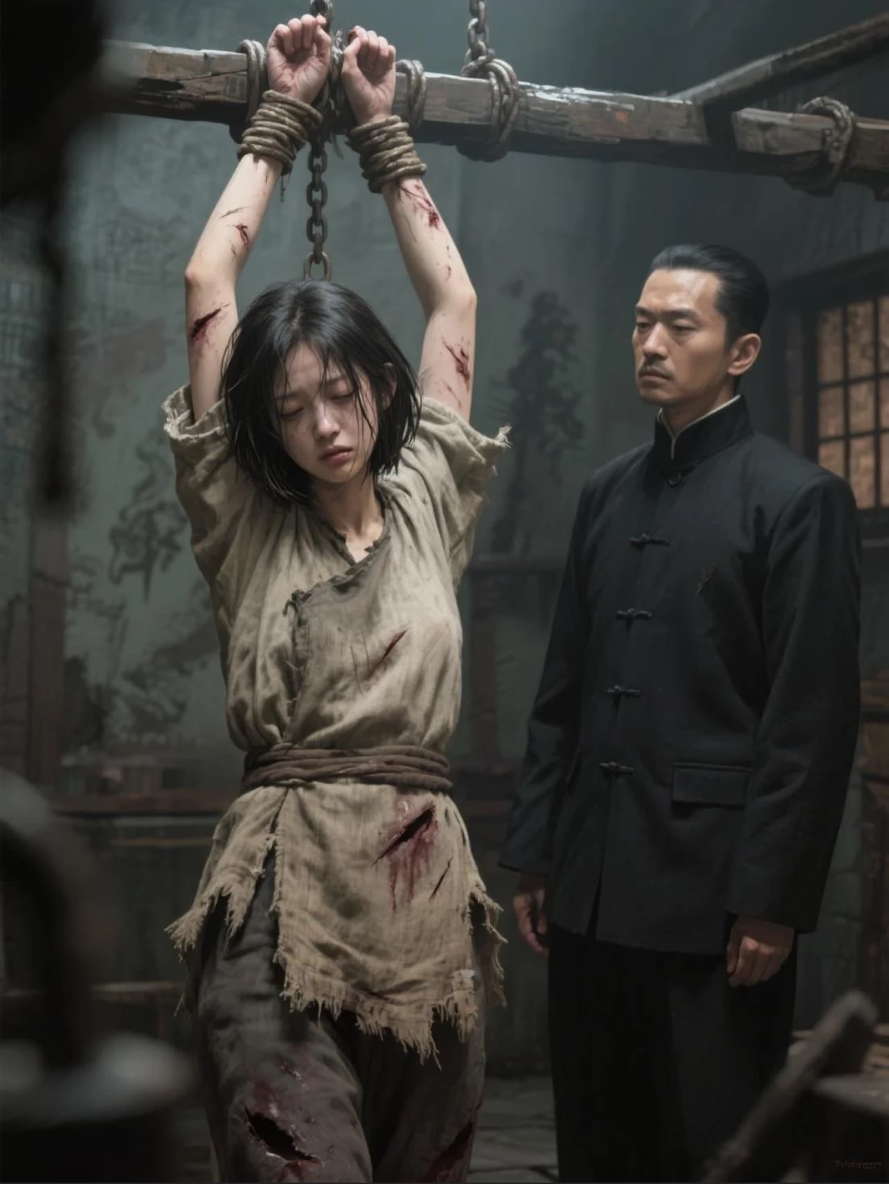 沈岚的粗麻囚衣碎成破絮,血痕从肩头渗到脚踝,乌青的脸歪靠一旁,乌发黏在汗津津的脸颊。腕间铁链深深勒进渗血的皮肉,整个人陷在昏迷的死寂里,像是耗尽最后一丝气力才撑住这具躯壳。曾经在学堂里振臂喊着“救亡图存”的鲜活模样,和眼前遍体鳞伤的躯壳重叠又撕裂。