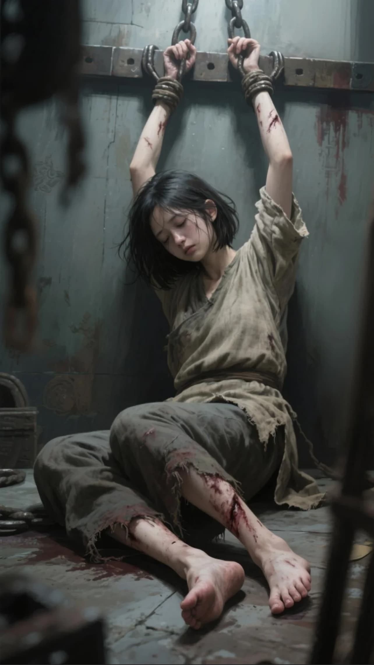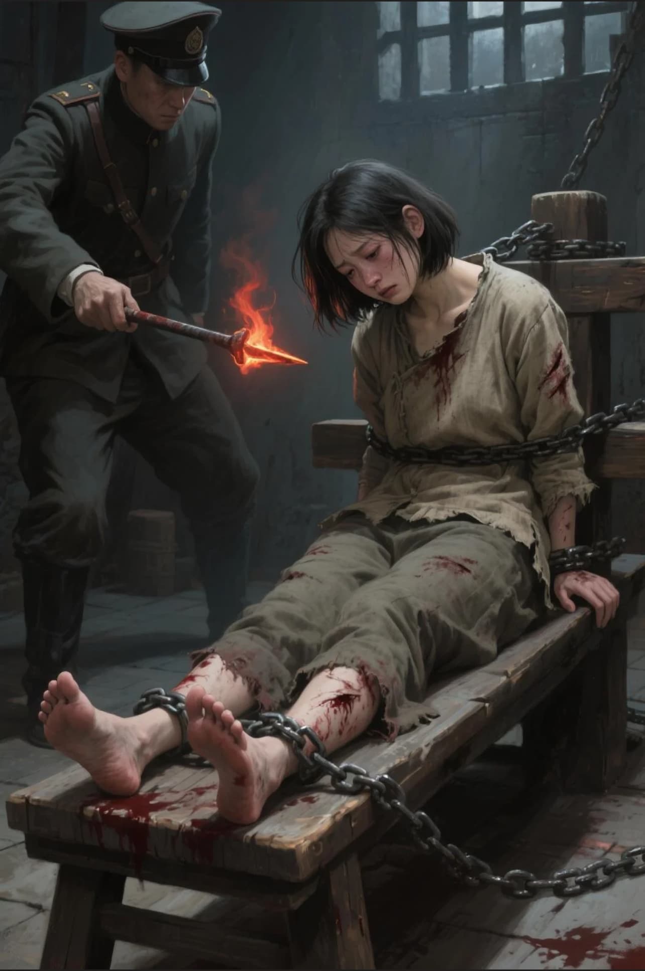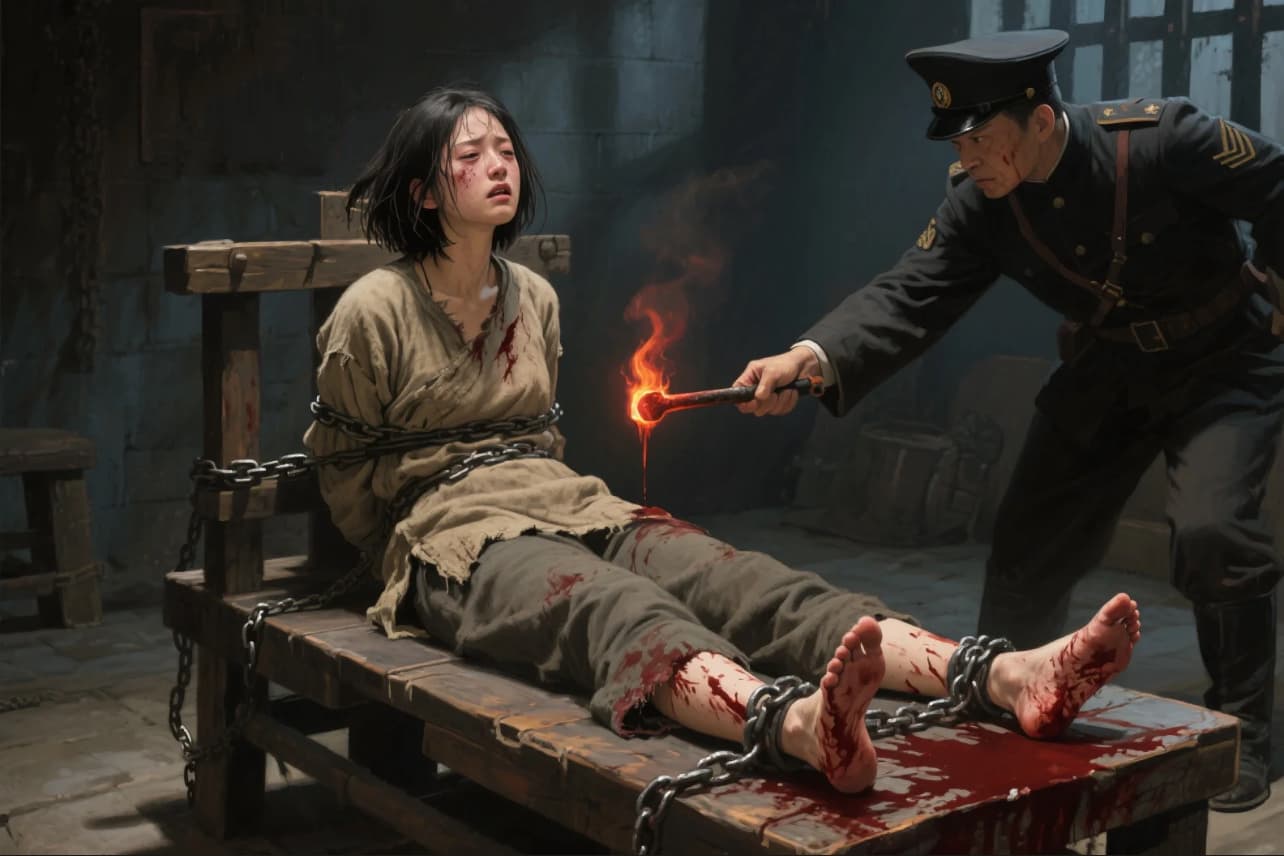 沈岚整个人被粗重的铁链死死缚在刑椅上,从躯干到四肢都动弹不得,铁链深深勒进带着血痕的肌肤里,仿佛要将骨头都缠紧。在阴暗的刑室中,哪怕烧红的烙铁近在咫尺,身体因极致的恐惧与剧痛控制不住地颤抖,但是嘴唇却被她死死咬住,几乎要渗出血来,她垂下的眼眸里,没有屈服的泪光,却有不肯熄灭的光——像暗夜里倔强的星火,对抗着眼前所有的狰狞与暴虐。
