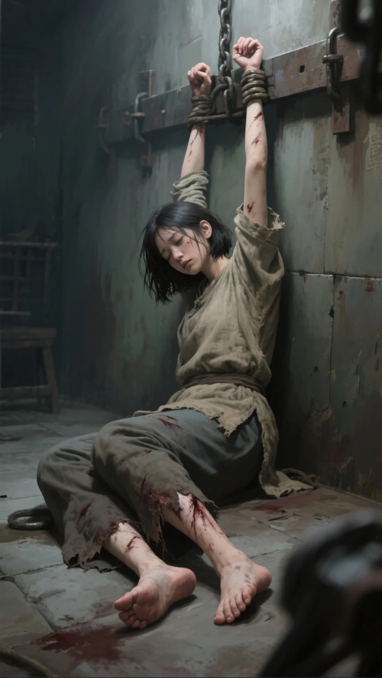 刑讯暂且停歇,可对她的折磨却从未止息。折磨却换了刑具的筋骨。特务拖她如拖腐肉将她带回牢房,将手铐锁在墙。铁铐咬进腕骨——新裂的伤口渗出血珠,顺着铁链缝隙,一滴滴砸在地牢的脏污里。