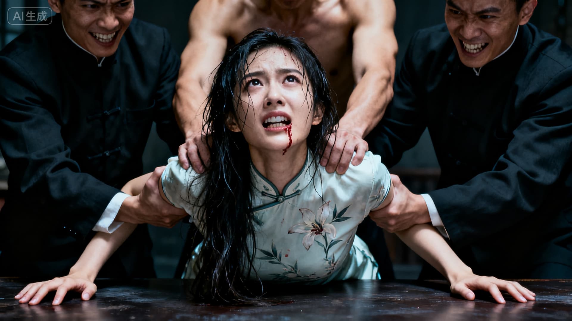 口腔里是咸涩的血腥味和牙齿咬破舌尖的锐痛,这是她对抗惨叫和更深处呜咽的最后一道防线。汗水和先前泼在脸上的冷水混在一起,从她湿透的发梢滴落,与某些无法言说的粘腻触感混合,模糊了视线与感知。