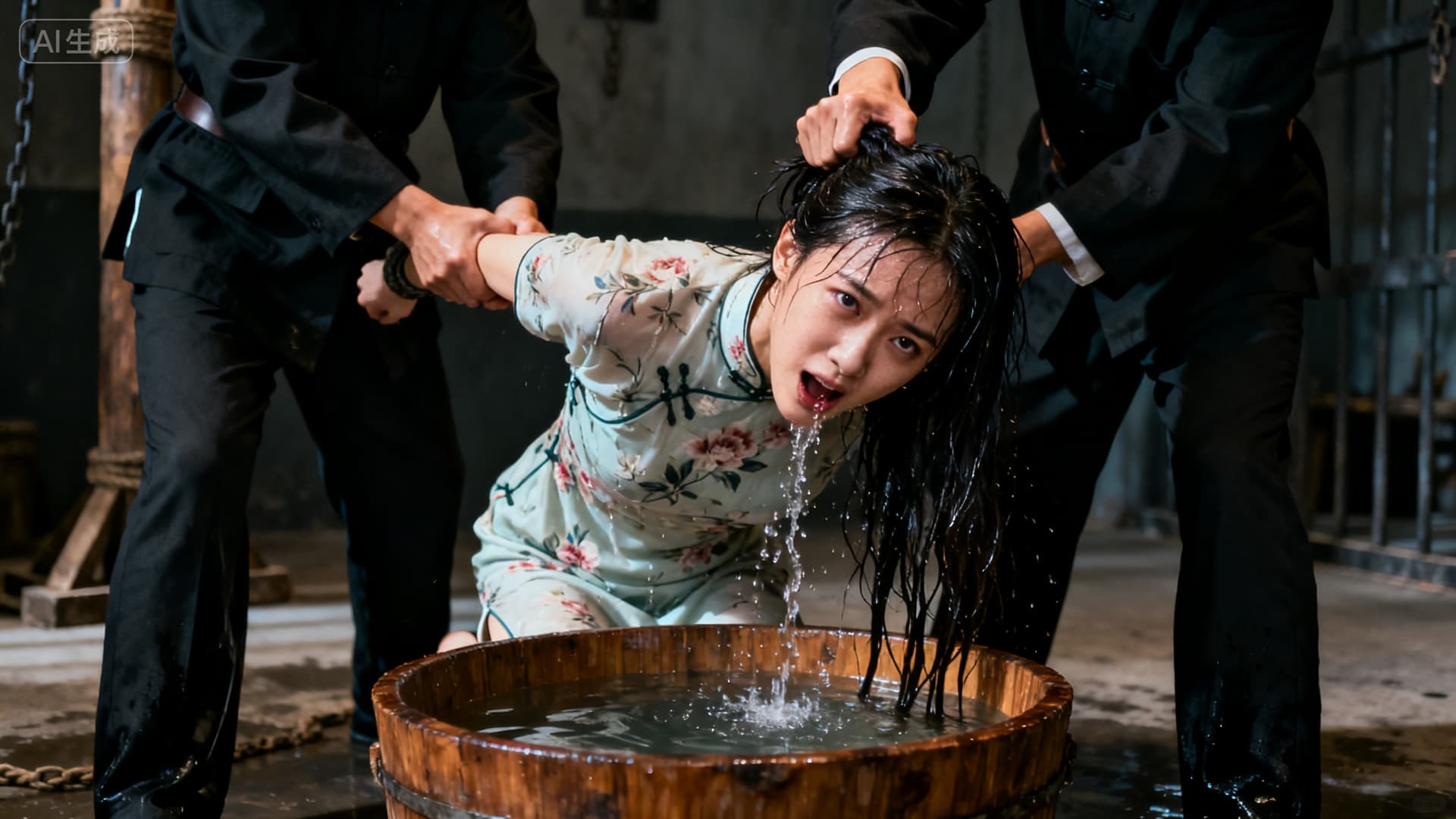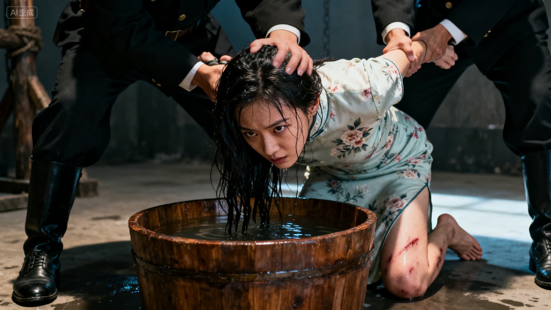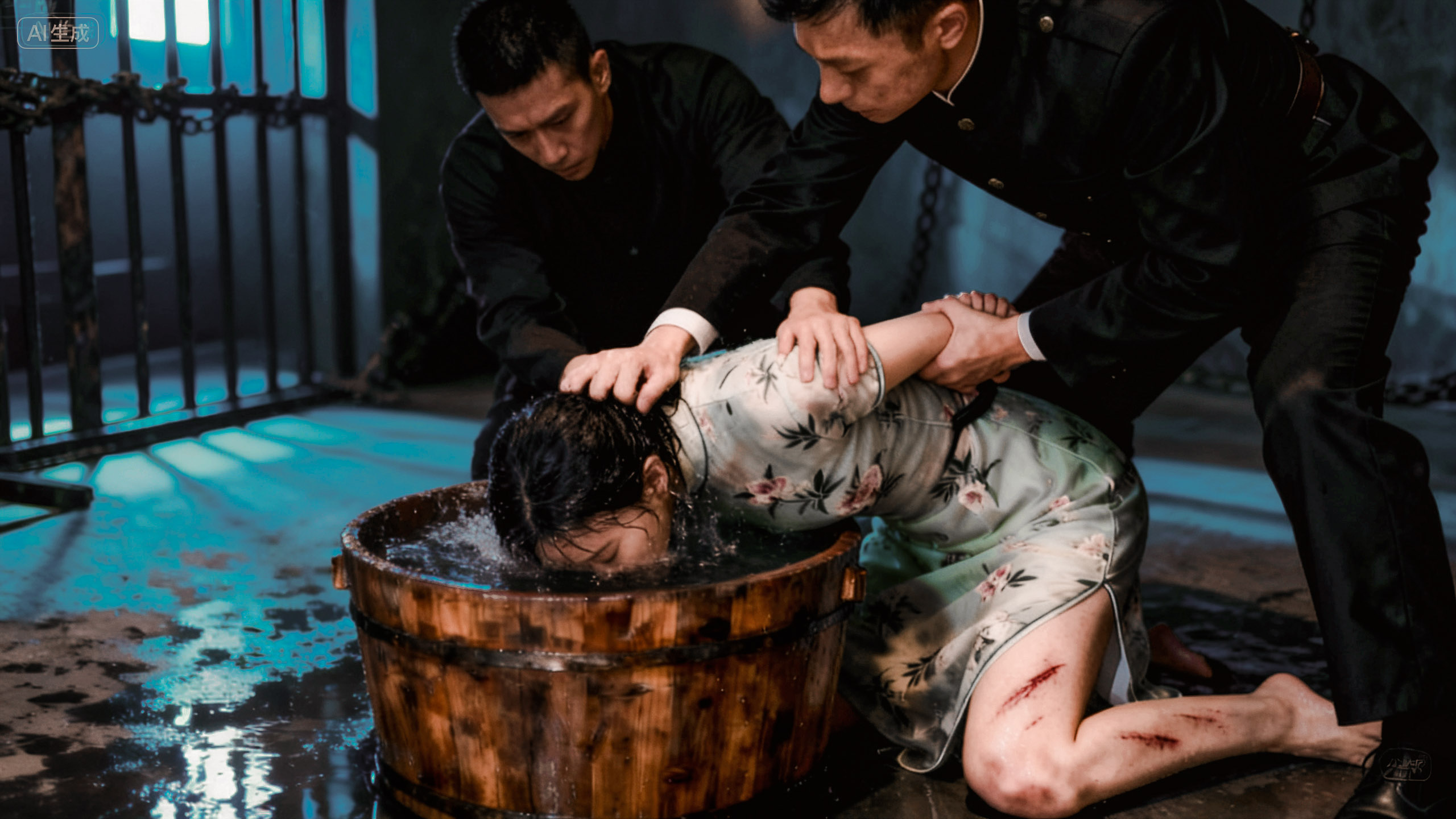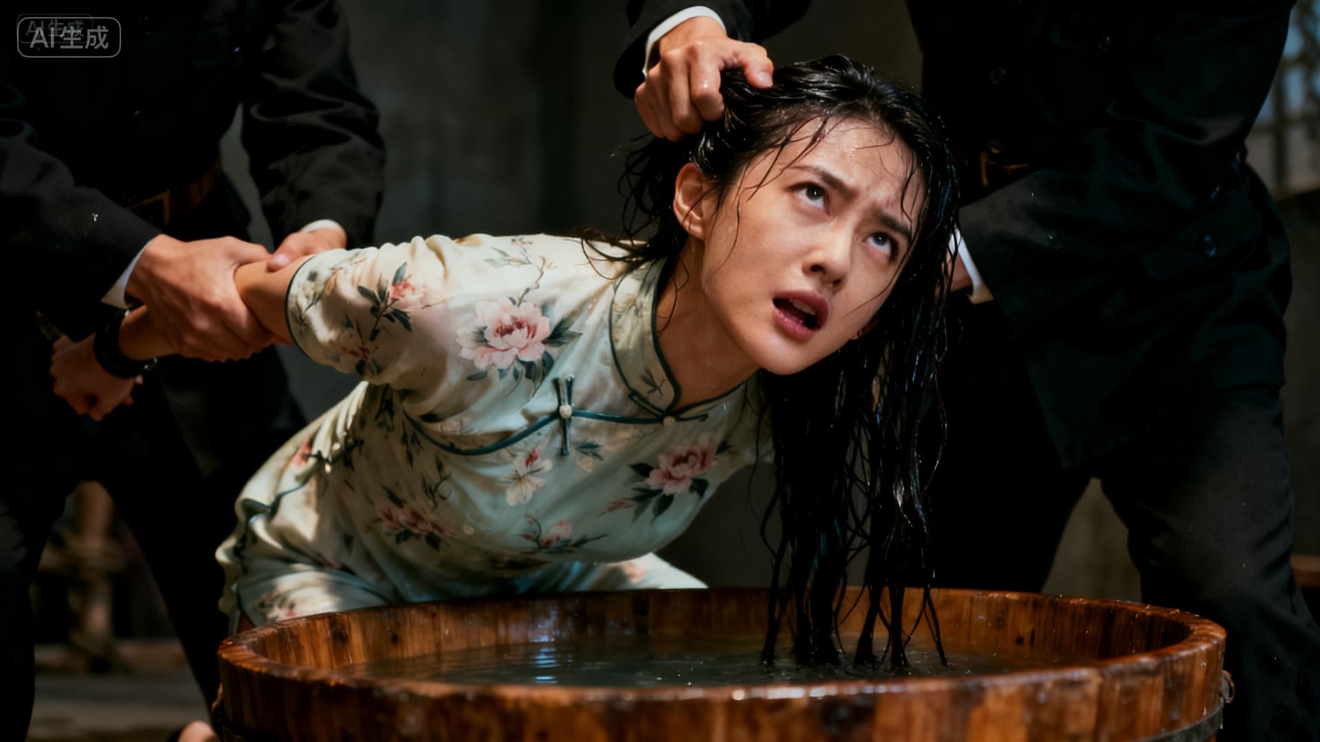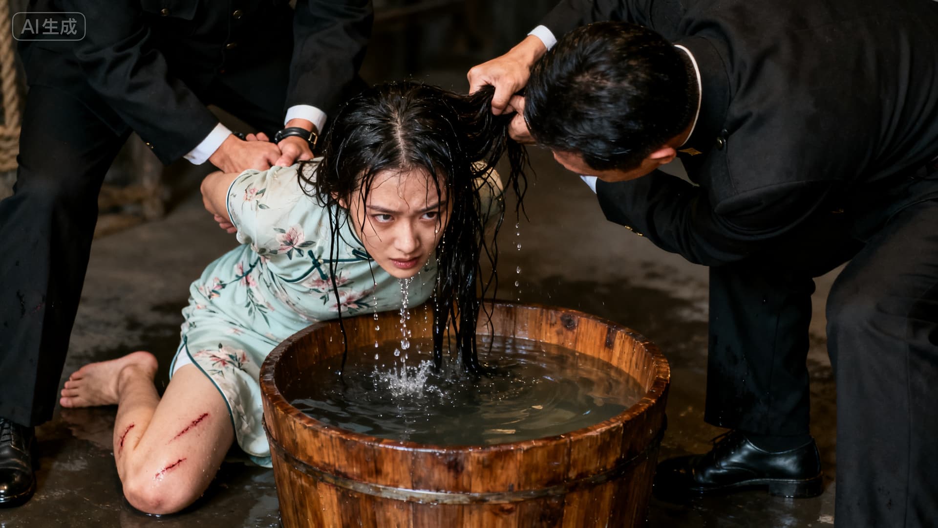 特务粗暴地抓住她的头发,将她的头猛地按向那桶水。在距离水面仅一寸之处停住,她的鼻尖几乎触碰到冰冷的水面,能清楚地看见自己在水中的倒影——面色潮红,发丝凌乱,唯独眼神清亮。