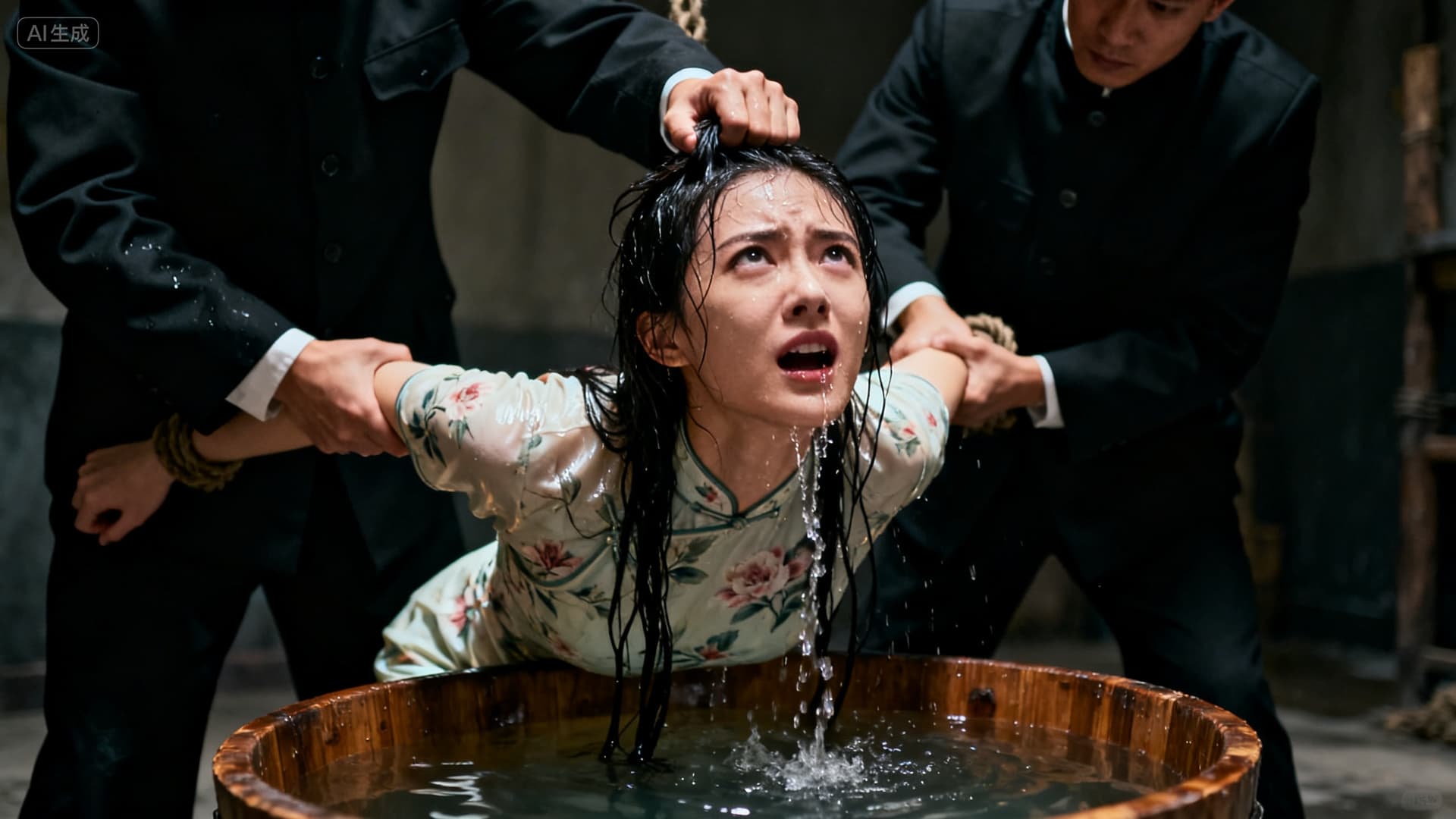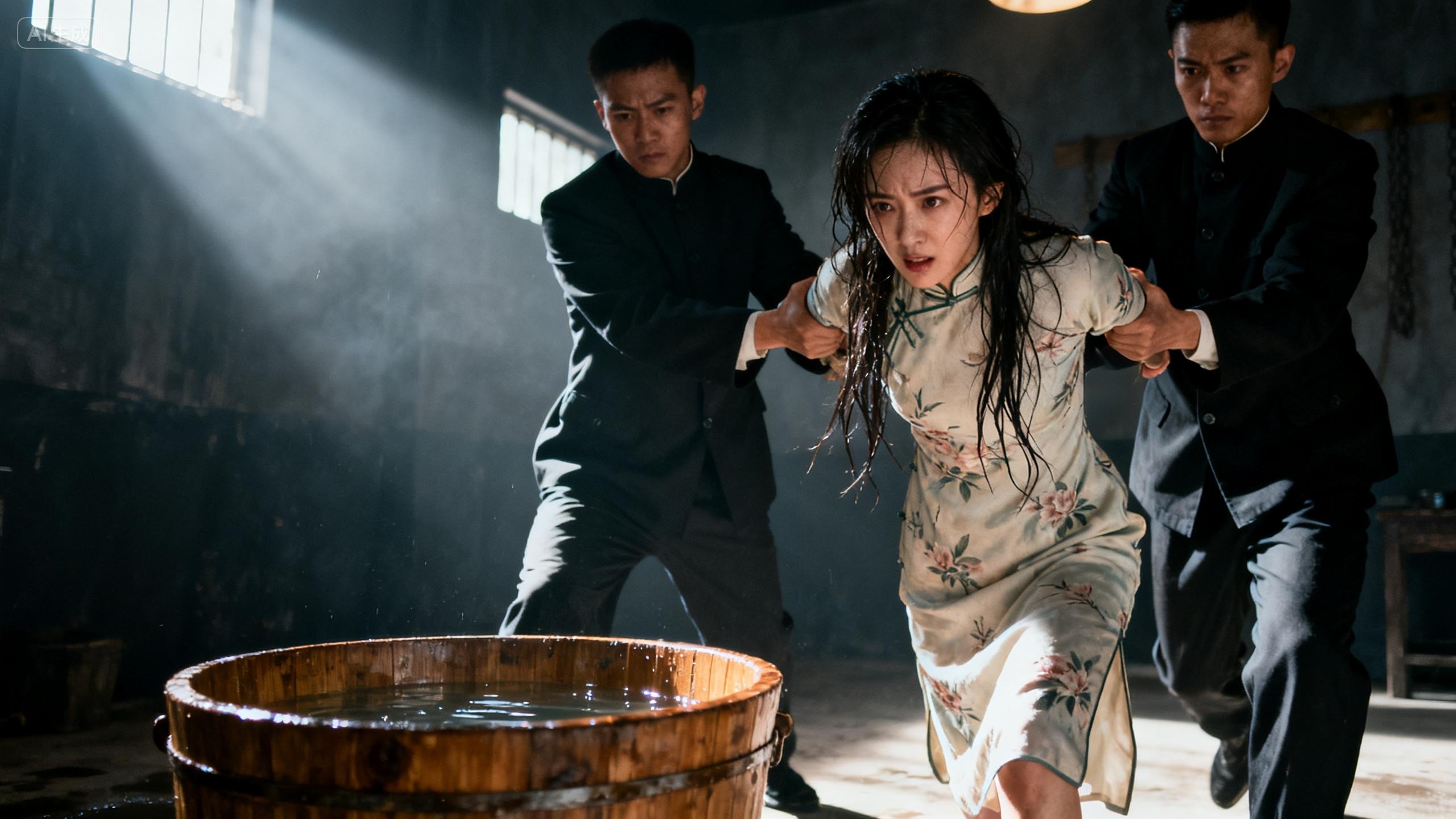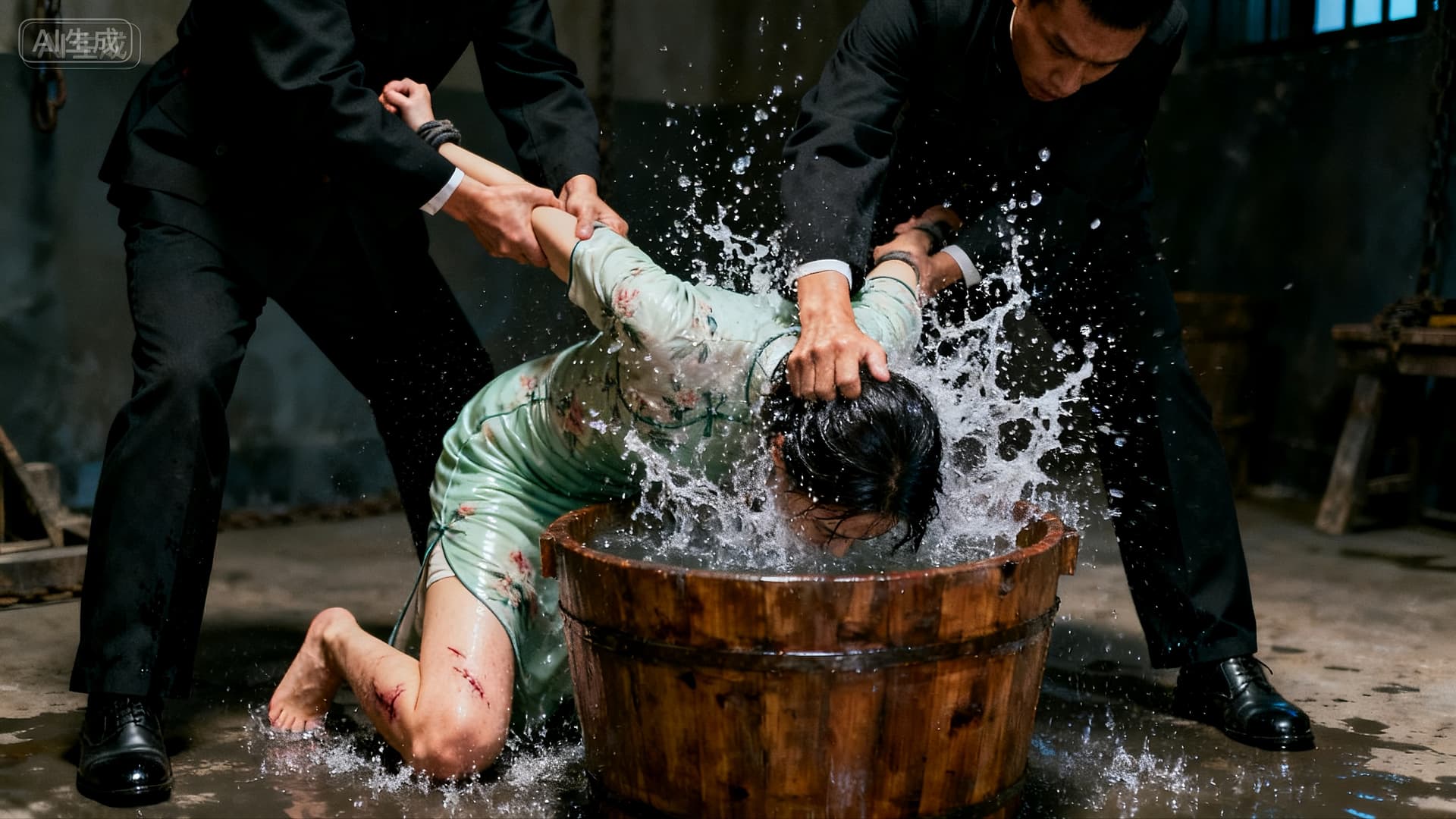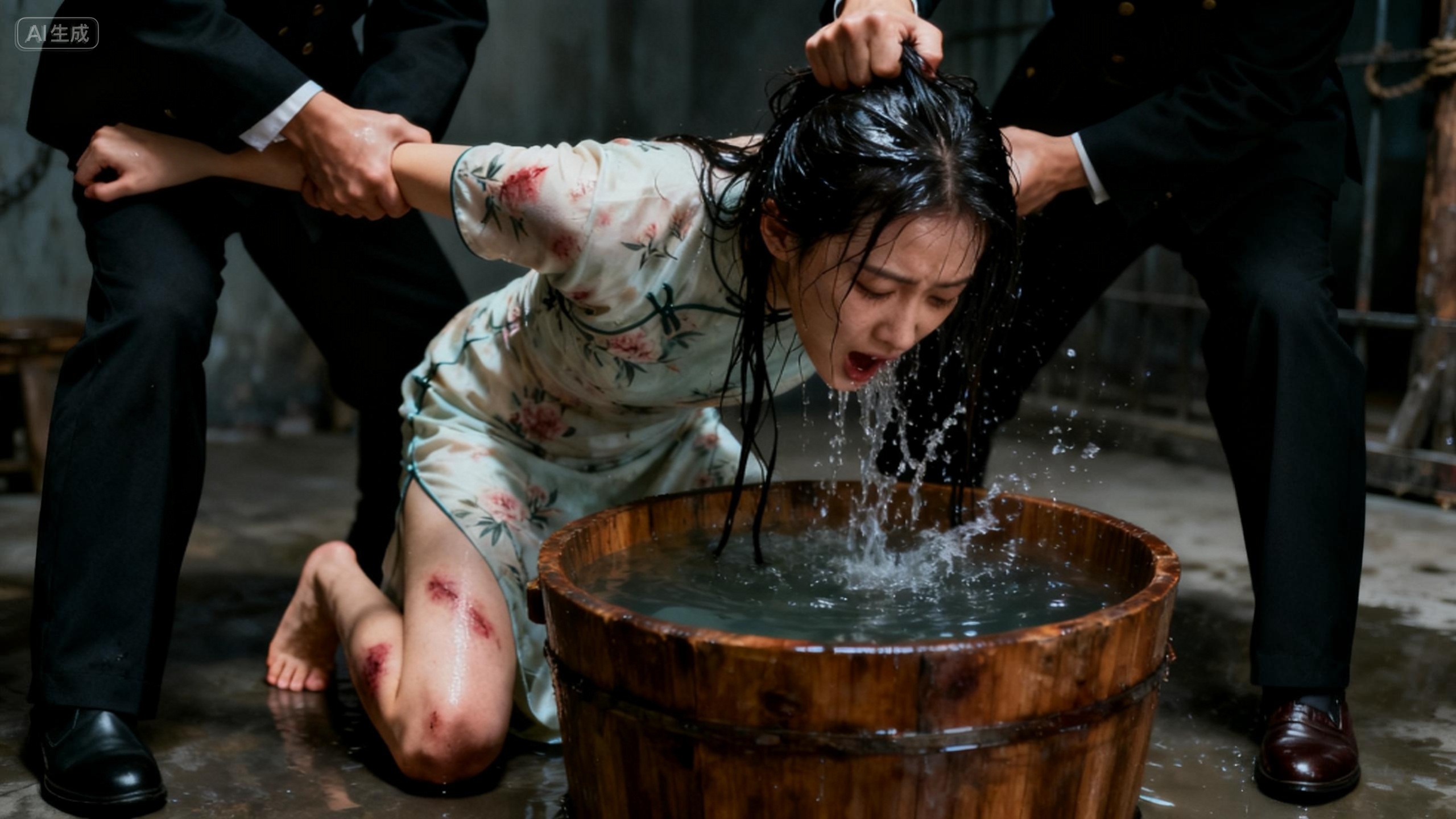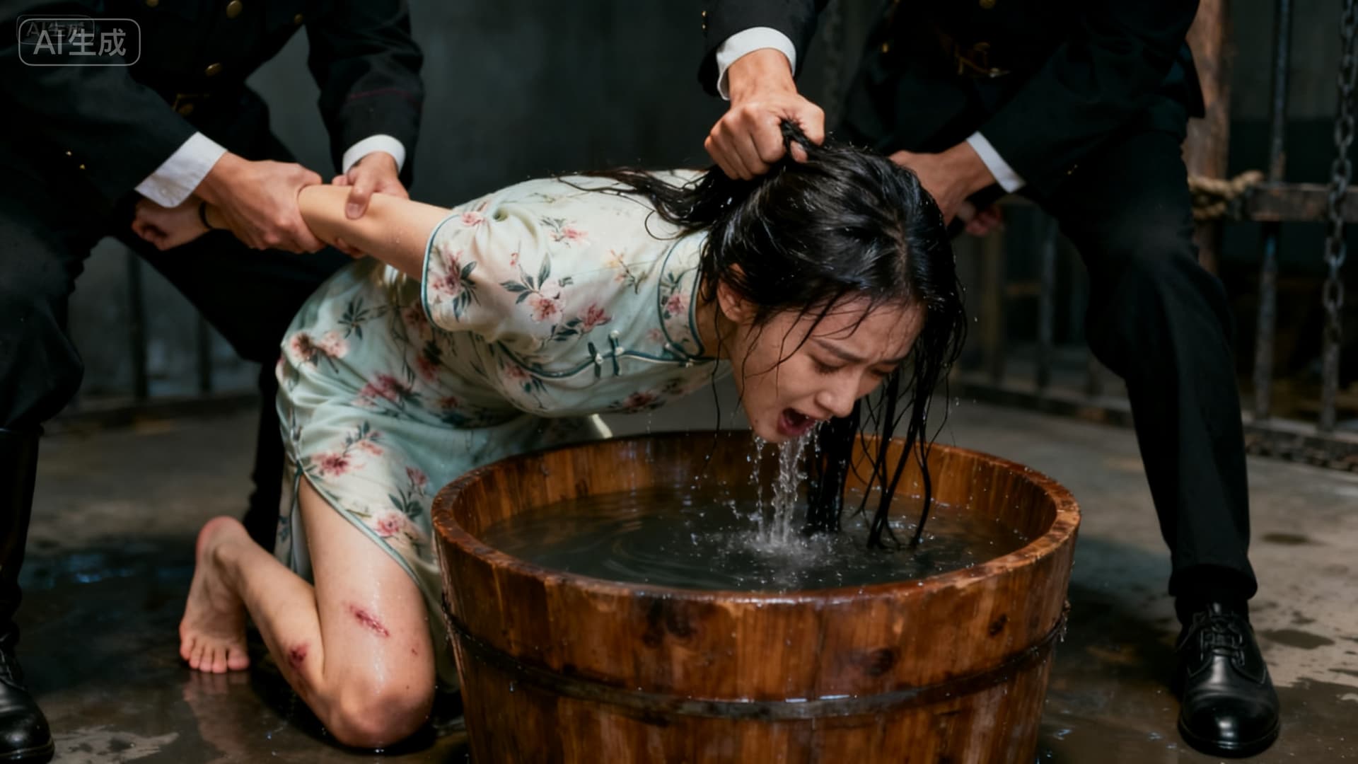 特务粗暴地抓住她的头发,将她的头猛地按向那桶水。在距离水面仅一寸之处停住,她的鼻尖几乎触碰到冰冷的水面,能清楚地看见自己在水中的倒影——面色潮红,发丝凌乱,唯独眼神清亮。