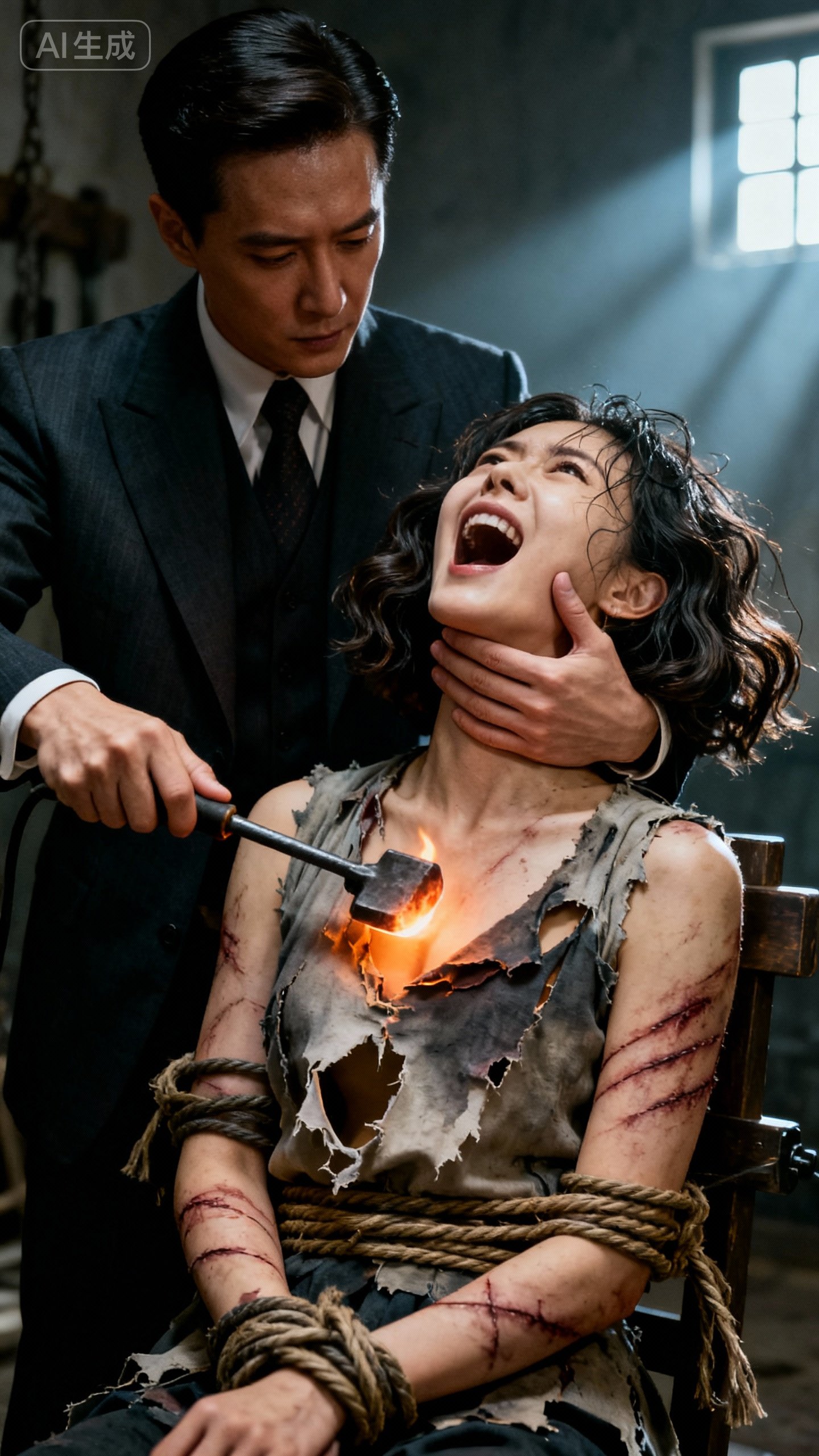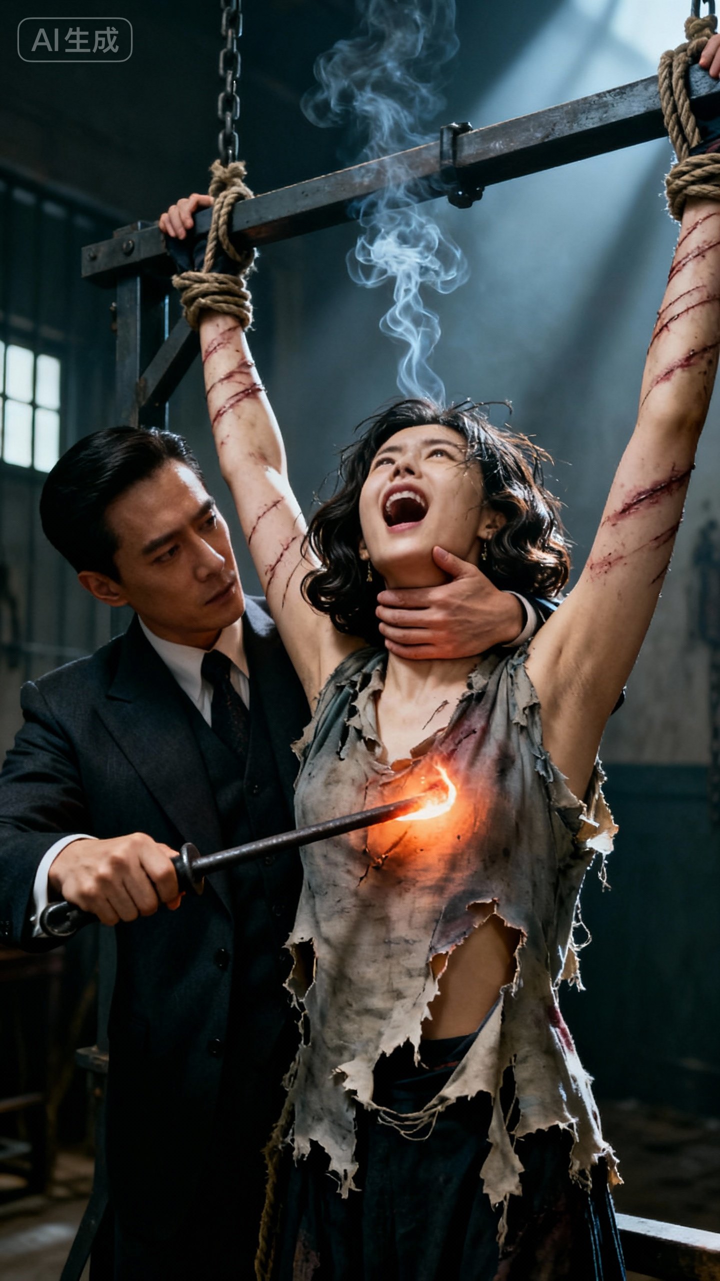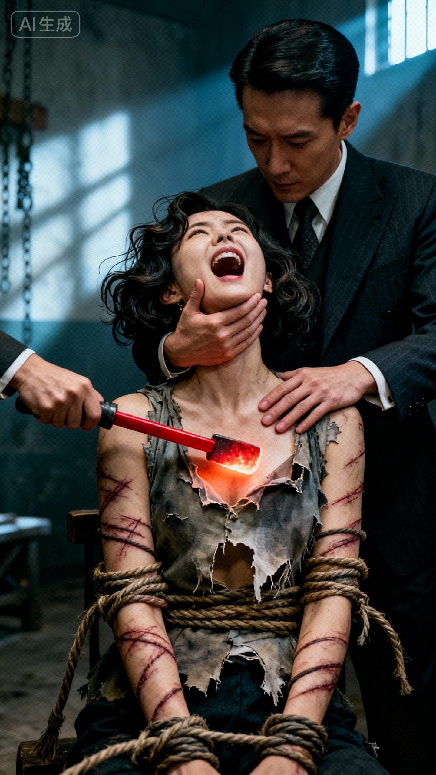 这个动作本身直接写“按在女子身上”就行,如果ai有规避暴力行为,会让打手用自己的手挡烙铁,比如这样