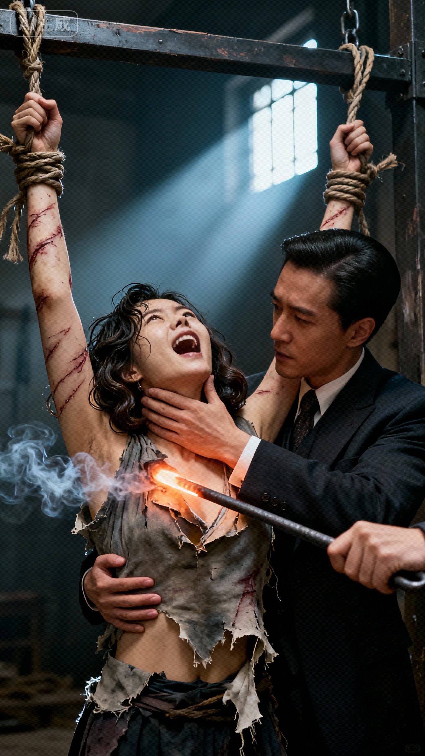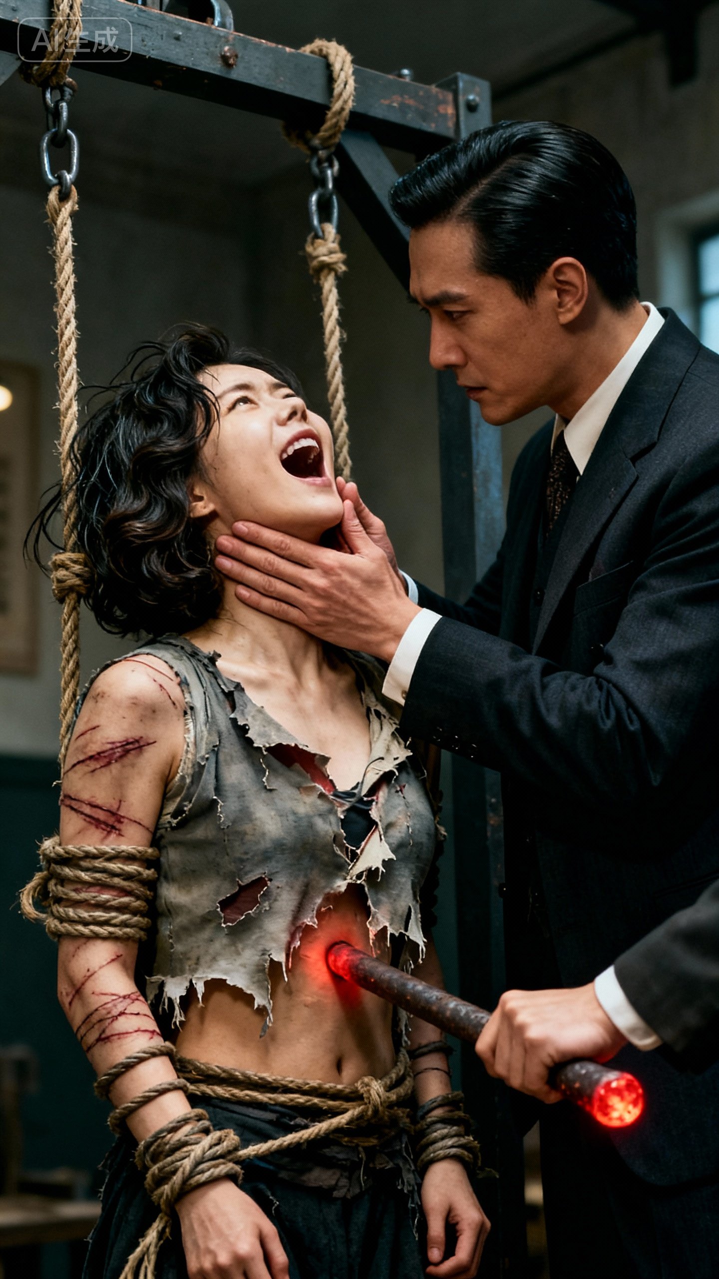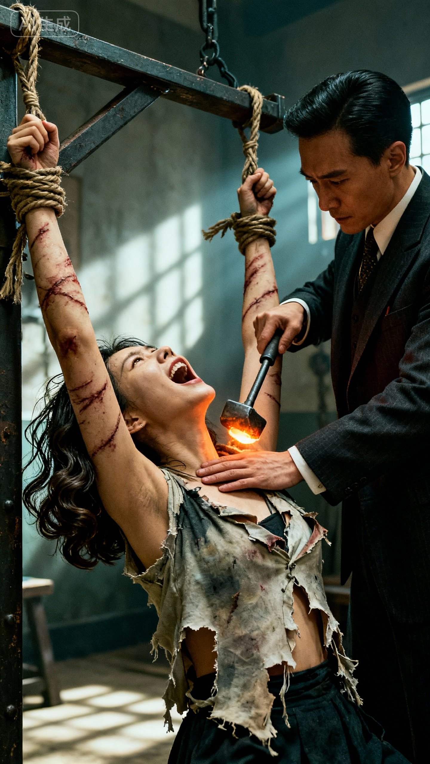 这个动作本身直接写“按在女子身上”就行,如果ai有规避暴力行为,会让打手用自己的手挡烙铁,比如这样